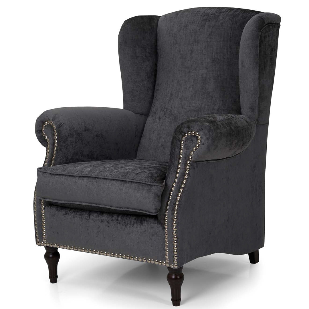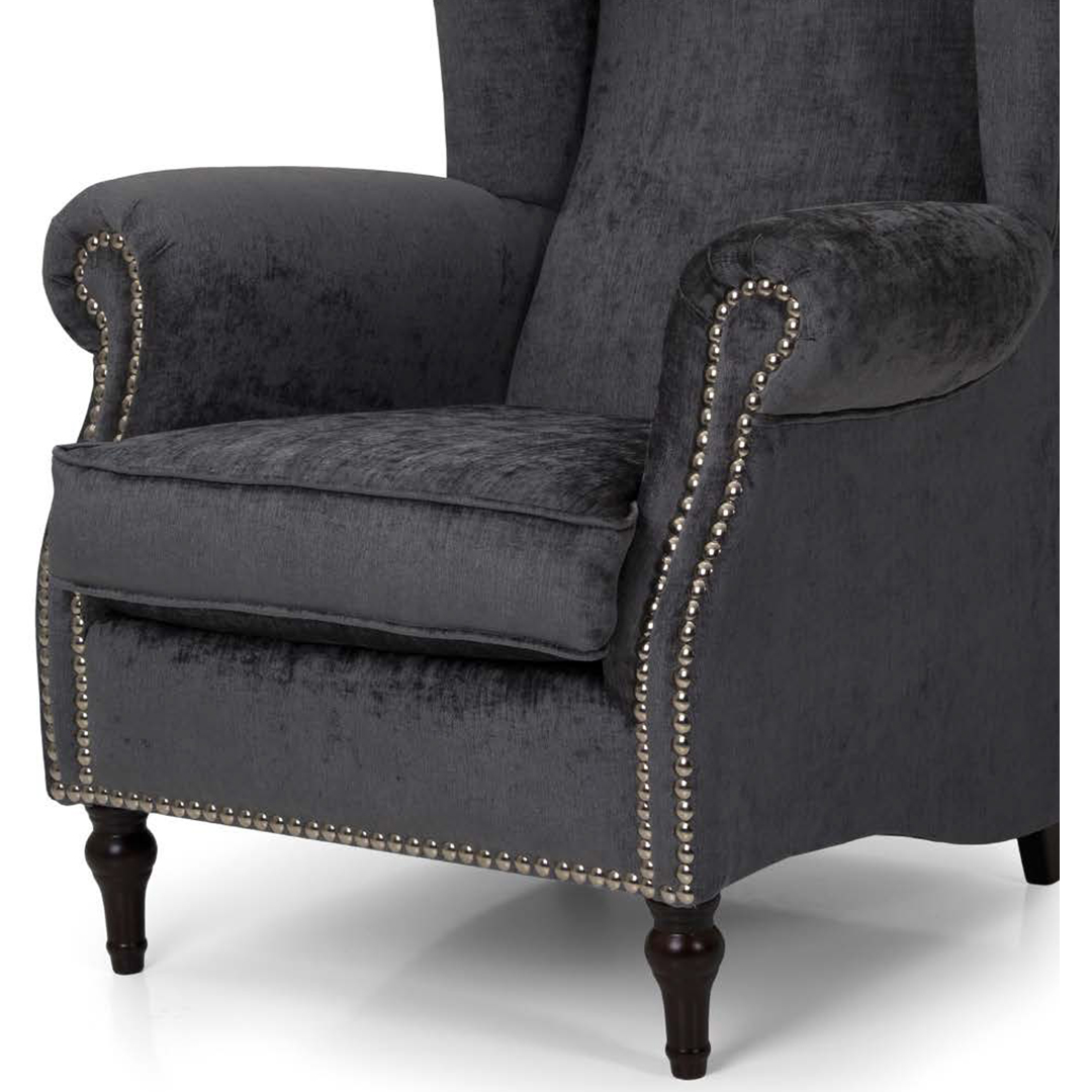 A esta clásica butaca orejera se le ha actualizado el diseño con un detalle más moderno con la incorporación de una doble fila de tachuelas en brazos y faldón.