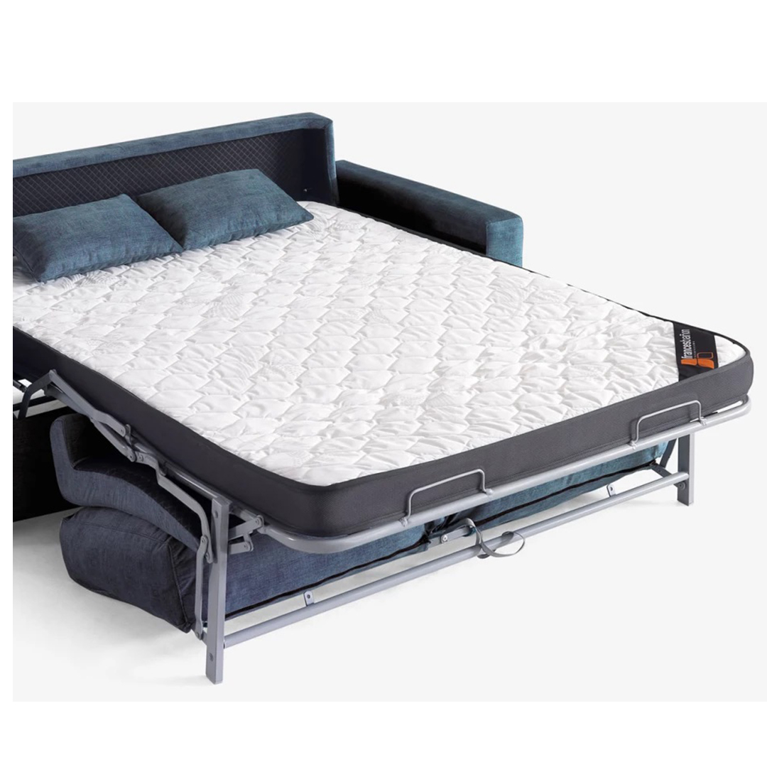 Este modelo incluye un arcón de almacenaje integrado, ideal para guardar ropa de cama, cojines o mantas, manteniendo tu salón siempre ordenado. Además, gracias a su sistema de apertura italiana, podrás desplegar la cama de forma rápida y sencilla, con un solo gesto y sin necesidad de quitar los cojines.